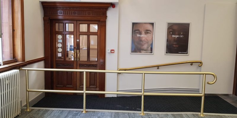 Custom made double-rail, four-post brass balustrade; installed in public/retail area in bank. The balustrade was fabricated and finished to match […]