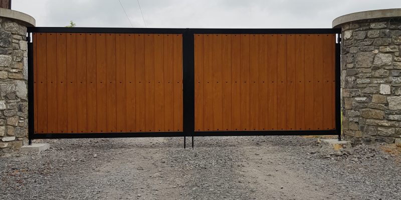 Steel framed entrance gates clad with timber effect plastic boards. All steel work is hot dipped galvanised with a black […]